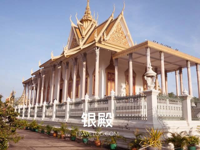 银殿,又称银阁寺,建于1892年至1920年间, 于1962年依据柬埔寨传统建筑重修,地板由5329块各重1.125公斤的银砖铺成,共5吨重,故称为银阁寺,加上寺内数百件国宝级金银宝物,所以又称为金银阁寺。因寺内供奉玉佛又称玉佛寺。寺中央有一座18k金打造的佛像,重90kg,佛身上镶有9584颗钻石,最大的一颗镶在佛身胸前,重25克拉。这尊佛像是为了纪念西索瓦国王打造的。